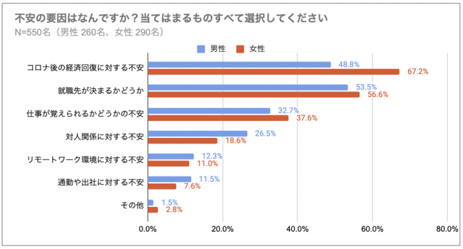 「不安がある」と回答した人に要因を尋ねると、最も多かったのは「コロナ後の経済回復」(58.5%)で、次いで「就職先が決まるかどうか」(55.1%)が挙がり、まだ就職先が決まっていない人が多いこと、また、男性よりも女性の方が経済回復への不安や就職への不安を感じている割合が高いことがわかりました。