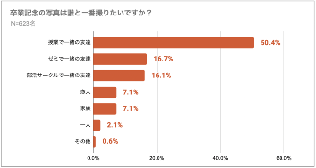 写真を撮ることを望む人たちに「誰と一緒に撮りたいか」を尋ねると、最も多かったのは「授業で一緒の友達」(50.4%)で、次いで、「ゼミで一緒の友達」(16.7%)、「部活サークルで一緒の友達」(16.1%)、「恋人」(7.1%)、「家族」(7.1%)という結果になりました。