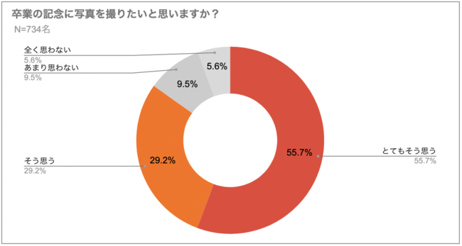 卒業の記念に写真を撮りたいと思うかを問うと、84.9%が「撮りたいと思う」と回答。