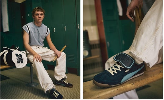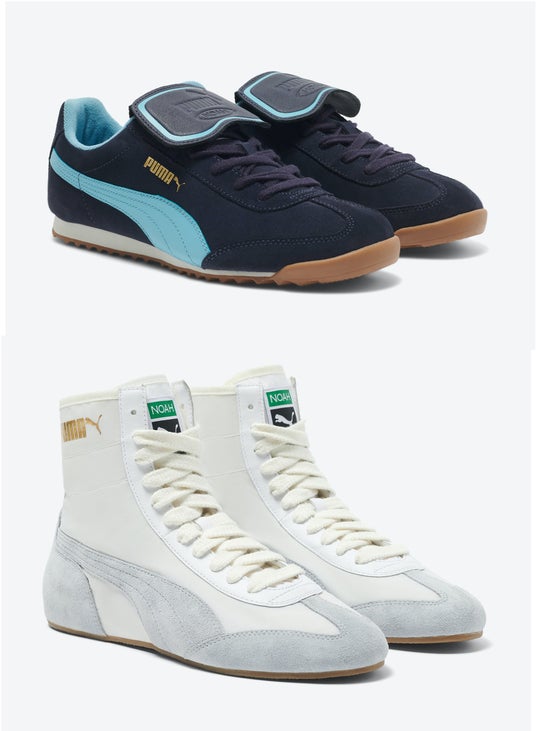 ARIZONA NOAHは、ネイビーブルーのしなやかなカシミアスウェードのアッパーに、パウダーブルーのフォームストリップにガムアウトソール、さらにシュータンには、プーマとNOAHのロゴが施されています。WRESTLING BOOT NOAHは、グレーとホワイトのニュートラルなトーンで仕上げられたユニークなハイトップモデルで、アッパーにレザーのオーバーレイ、ゴールドのプーマロゴやコラボレーションロゴなどがデザインされています。