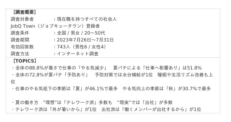 そこでJob総研では、夏の暑さによる仕事のやる気の減少度、及び夏バテ経験と予防の有無、仕事のやる気が高低する時期と原因、さらに理想と現実の夏の働き方などを調査した「2023年 夏の働き方実態調査」を実施しました。
