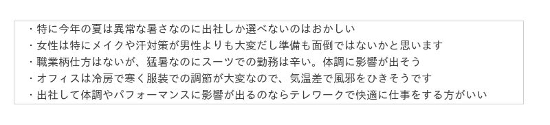 夏の働き方に関しては気温が影響するなどのコメントが顕著でした。