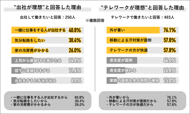 夏の働き方で「出社が理想」と回答した250人の出社を希望する上位3つの理由は、「一緒に仕事をするメンバーが出社するから」が40.8%と最多となり、続いて「気分転換をしたいから」が30.4%、「テレワークだと冷房費がかかるから」が26.0%となりました。一方、夏の働き方で「テレワークが理想」と回答した493人のテレワークを希望する上位3つの理由は、「外が暑い」が76.1%と最多となり、続いて「移動による汗対策が面倒」と「テレワークの方が快適」が同率で57.8%となりました。
