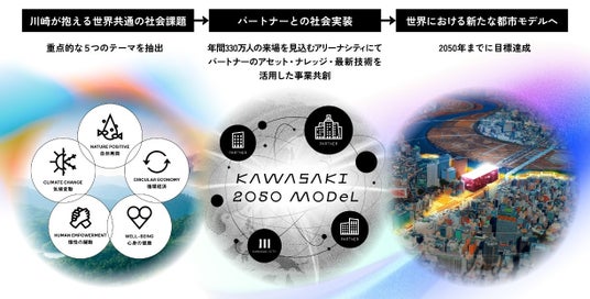 川崎が抱える課題を基に、世界共通の社会課題から5つの重点テーマを選定し、「Kawasaki Arena-City Project」を舞台に様々なパートナー企業との共創による社会実装を通じて2050年までに設定したゴールを達成し、世界における都市の新たなモデルになることを目標として始動します。