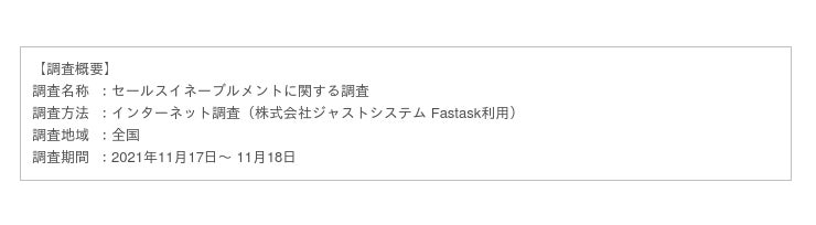 株式会社イノベーション(マザーズ 証券コード3970)のグループ会社である、株式会社Innovation & Co.が運営するセールスイネーブルメントツール『Sales Doc(セールスドック)』は、2021年11月17日(水)~11月18日(木)にかけて、全国の法人営業職を対象に「セールスイネーブルメントに関する調査」を実施いたしました。