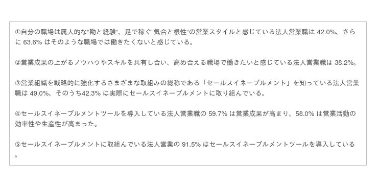 法人営業職が求めていること、その解決策となり得る「セールスイネーブルメント」の成果状況に関して調査を実施しましたので、今後の営業組織構築に向けてご活用ください。