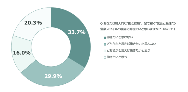 本調査では、法人営業では「ノウハウ・スキルの共有」や「戦略性」などの必要性を求める声が多いにも関わらず、法人営業職531名のうち42.0%が、所属している職場が「属人的な "勘と経験" 、足で稼ぐ "気合と根性" の営業スタイルだ」と感じており、さらに63.6%はそのような職場では働きたくないと感じていることがわかりました。