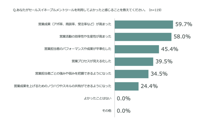 セールスイネーブルメントツールを導入している法人営業職119名のうち 59.7% は営業成果が高まったと感じているという結果になりました。また、58.0% は営業活動の効率性や生産性が高まったと感じているという結果に。
