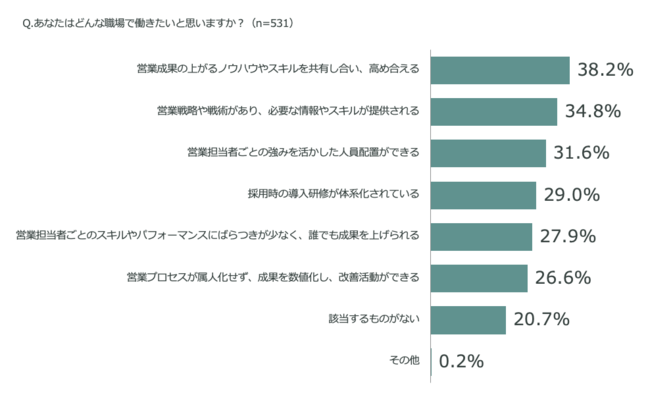 法人営業職531名のうち 38.2% は営業成果の上がるノウハウやスキルを共有し合い、高め合える職場で働きたいと感じている。次いで、生業戦略や戦術があり、必要な情報やスキルが提供される、営業担当者ごとの強みを生かした人員配置ができる、などが挙げられる。