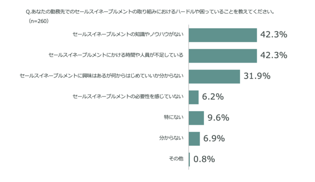 セールスイネーブルメントを知っている法人営業職260名が感じるセールスイネーブルメントの取組みにおけるハードルは「知識やノウハウがない」「時間や人員が不足している」という回答が上位に挙がる一方、セールスイネーブルメントに取組んでいる法人営業の 91.5% はセールスイネーブルメントツールを導入しているという結果に。