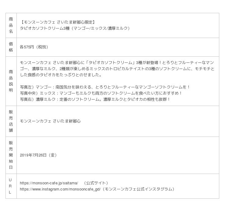 「モンスーンカフェ さいたま新都心」では、店舗限定商品「タピオカソフトクリーム」3種を2019年7月26日(金)より販売いたします。