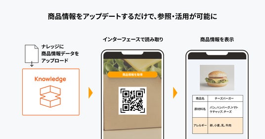 自社の商品情報をナレッジにアップロードすることで、QRコードや商品画像などから商品情報を参照できるようになります。その場で簡単に原材料やアレルギー情報をチェックできる「アレルギーチェッカー」の構築なども可能です。スーパーマーケットやレストランなど、幅広い場面でご活用いただけます。