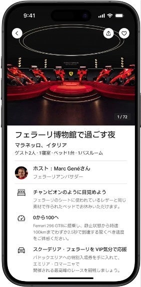 イタリアのマラネッロにあるフェラーリ博物館に滞在し、レースの世界を満喫しましょう。フェラーリのシートと同じ革で作られたベッドで眠り、スクーデリア・フェラーリのドライバーアンバサダーであるマーク・ジーンと一緒にレーストラックを一周し、VIPとしてエミリア・ロマーニャグランプリを観戦します。