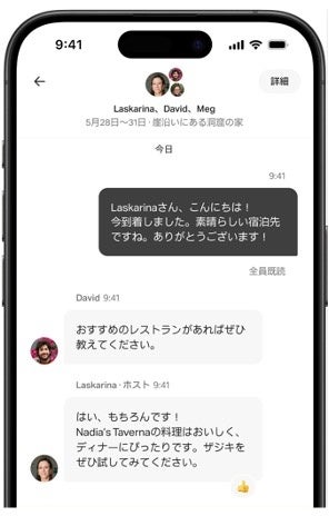 新しいメッセージタブ メッセージタブのデザインが一新され、旅行に参加する方全員がグループスレッドでホストとメッセージをやり取りできるようになりました。デザインがシンプルになり、ゲスト、ホスト、カスタマーサポートのメッセージがすべて一箇所に集約され、メッセージを簡単に検索できるようになりました。リアクション機能により、ゲストとホストは絵文字を使って反応することができます。また、AIによるクイック返信の提案により、ゲストからのよくある質問にホストが即座に返答できるようサポートします。