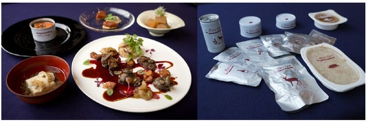 フランス料理である鹿スネ肉の煮込みを、国産ジビエ認証施設・長野県富士見高原ファームの鹿スネ肉をレトルトすることで実現した一品。農作物に大きな被害を与える野生鳥獣の代表格である鹿の肉の中でも人気のないスネ肉は、本来下処理や加熱に時間がかかるが、レトルトすることで、多くの手間を省きながら、安全でおいしい料理に仕上げることができることがわかった。また、付け合わせを個々にレトルトパックすることで、一皿に異なる風味の素材を盛り付けること、さらに新たな素材との組み合わせでバリエーションが広がる可能性を見出した。レトルトのクオリティを上げることで、常温ストックのレトルト食品を高級料理として提供できる可能性を見出すこともできた。