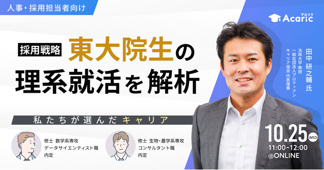 技術者・研究者に特化した採用・キャリア支援サービスを提供する株式会社アカリク(本社:東京都渋谷区、代表取締役:山田 諒、以下「弊社」)は、東京大学在学の理系院生2名と、弊社顧問である法政大学教授の田中氏をゲストにお迎えし、「東大院生の理系就活を解析 ~私たちが選んだキャリア~」というテーマのウェビナーを開催いたします。
