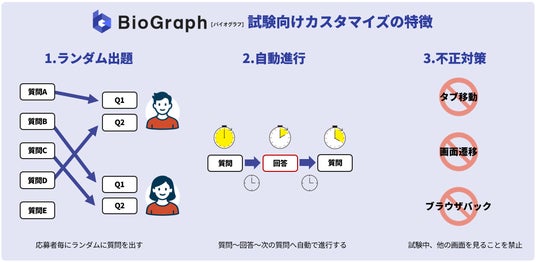 会話能力を測るには面接が適していますが、海外との時差によるスケジュール調整の問題もあり、リアルタイムでのインタビュー実施も難しいことから録画選考の導入を検討することとなります。一方で、ビデオ提出方式の場合、応募者が任意のタイミングで実施できるため、回答を事前に準備することができるなど公平性を担保できないという問題があります。これらの不正を防止し、出願者の多様な英語力および適性を公平に評価することができる録画選考のシステムを検討した結果、BioGraphの録画選考システムが導入されることとなりました。