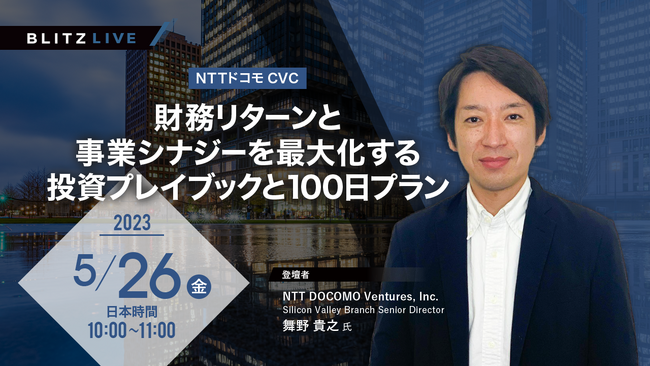 TECHBLITZ主催のオンラインセミナー「BLITZ LIVE」。今回は、NTTドコモのCVCにあたるNTTドコモ・ベンチャーズのシリコンバレー支店 シニアディレクターの舞野 貴之氏にご登壇いただきます。