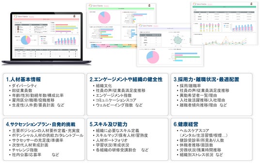 プラスアルファ・コンサルティングでは、タレントマネジメントシステム「タレントパレット」を通じて、採用から人材配置、人材育成、エンゲージメント向上、健康経営などあらゆる人事領域に対してデータに基づいた科学的なアプローチを支援してきました。人的資本開示のニーズが高まる中、タレントパレットの強みである各種人事データの集約と豊富な分析機能を活用し、ダイバーシティや要員計画、エンゲージメント指数、後継者育成状況、スキル保有人材状況など、企業が開示する人的資本指標の策定支援からダッシュボード構築までを支援する「人的資本開示支援コンサルティングサービス」を提供しています。