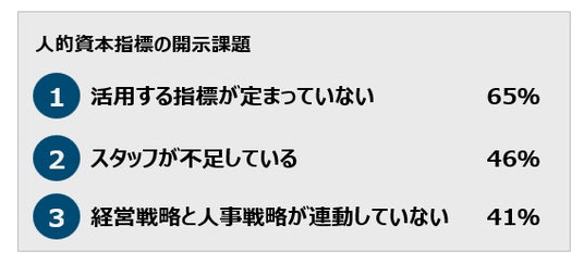 ・ 人的資本経営の開示課題としては、『活用する指標が定まっていない』、『経営戦略と人事戦略が連動していない」があげられている。