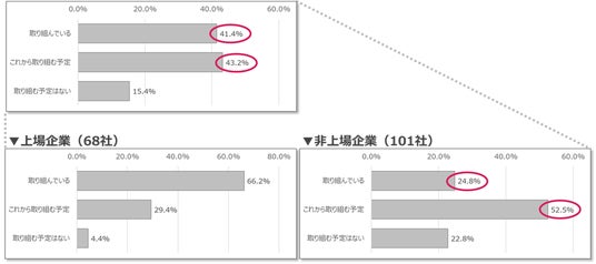 ♦人的資本開示に『取り組んでいる企業』は全体で約4割、『これから取り組む予定』を含めると8割を超え、さらに非上場企業でも関心が高まっている。