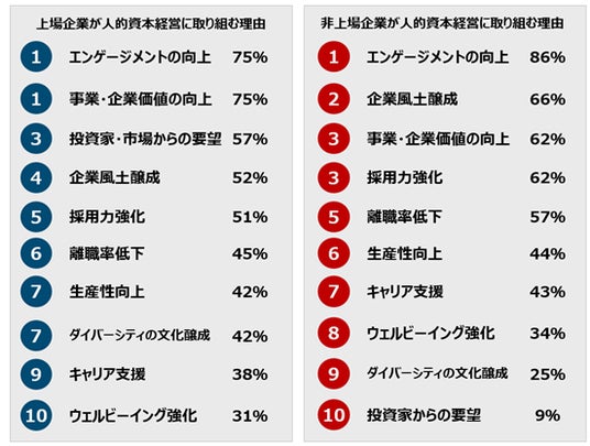 上場企業では、『エンゲージメントの向上』に次いで、『事業・企業価値の向上』、『投資家・市場からの要望』が続き、非上場企業では、『企業風土醸成』、『採用力の強化』、『離職率低下』などが上位となっている。非上場企業では、特に優秀な人材を惹きつけ、確保することを意識していることがうかがえる。