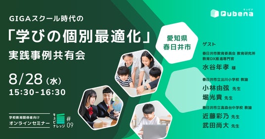 学習eポータル+AI型教材「Qubena(キュビナ)」を開発・提供する株式会社COMPASS(本社:東京都文京区、代表取締役:佐藤 潤、以下 COMPASS)は、全国の自治体・学校教育関係者向けに、ICT教材を活用した「学びの個別最適化」の実践事例を紹介するオンラインセミナー「キュビナレッジ(Qubena×Knowledge)」第九弾を、愛知県春日井市をゲストに迎えまして8月28日(水)に開催することをご報告いたします。