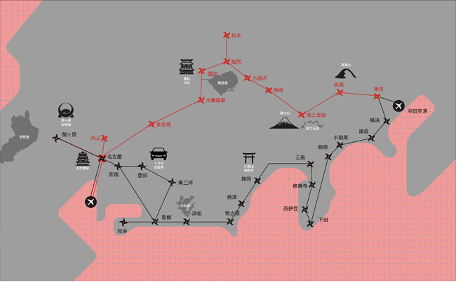 鎌倉・小田原編、富士・静岡編、尾張・三河編で構成された、67のスポットを巡るルートです。「食」「絶景」「スピリチュアル」をテーマに、3人の忍者が、東海道を旅します。港町横浜にはじまり、歴史情緒漂う鎌倉の自社仏閣をめぐり、小田原、箱根を抜け、静岡の茶畑や海岸線、奥三河の星空など堪能しながら、天下分け目の関が原の合戦場を目指します。