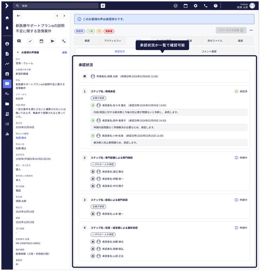 本機能は、保険代理店に寄せられるお問い合わせ・相談・苦情などの「お客様の声」を一元管理し、ステータス進捗・承認ワークフロー・CRM連動・外部API連携を通じて、保険代理店に求められる透明性と適正性を確保した対応プロセスを実現します。