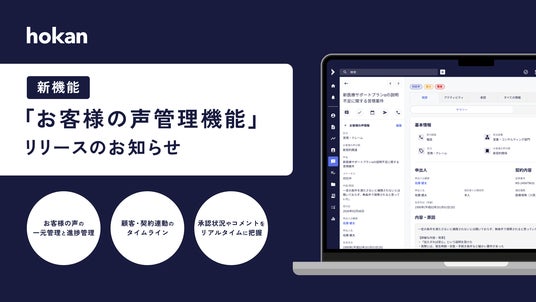 「適正な営業活動」と「組織の強固な監査体制」を支援するクラウド型保険代理店システム「hokan(R)︎」を提供する株式会社hokan(ホカン、本社:東京都中央区、代表取締役:横塚 出、以下:当社)は、新機能「お客様の声管理機能(VoC管理)」を2026年1月より提供開始したことをお知らせいたします。