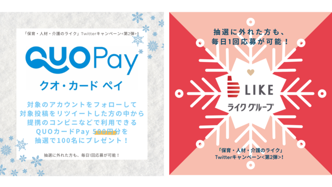保育・人材・介護の事業を展開するライク株式会社(東京本社:東京都渋谷区、代表取締役会長 兼 社長:岡本 泰彦、以下 ライク)は、グループ各社の情報を発信する「ライクグループ公式twitter」アカウントの企画として、12 月27日(火)から1月9日(月)の間QUOカードPayがもらえるフォロー&リツイートキャンペーンを実施いたします。キャンペーン期間中に、ライクグループTwitter公式アカウント(@LIKE__group)とプチギフト公式アカウント(@petitgift_mdp)をフォローの上、対象のツイートをリツイートいただくと、抽選で合計 100 名さまにQUOカードPay500円分が当たります。