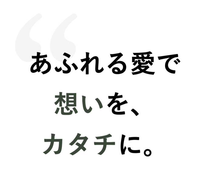 このたびの理念改定では、改めて「全国45万社の企業がある中で当社が存在する意義・理由」を熟考する機会となりました。社員全員で想いを込めて決定した「あふれる愛で 想いを、カタチに。」の理念を一人ひとりが体現できるようにならねばならないと、背筋が伸びる思いです。当社は今後も製造業という範疇を超えてさまざまな角度からお客様にお喜びいただけるサービスを提供しつづけ、社会に広く貢献してまいります。