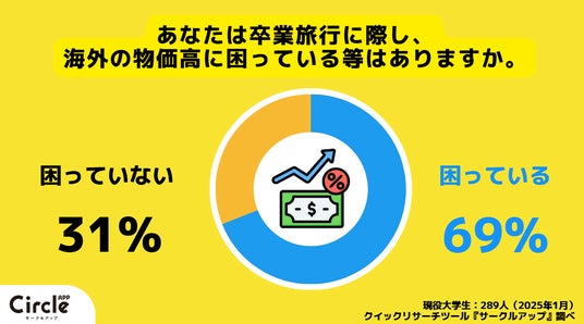 海外の物価高により卒業旅行が困っているか聞いてみたところ、現役大学生の69%が困っていると回答しました。