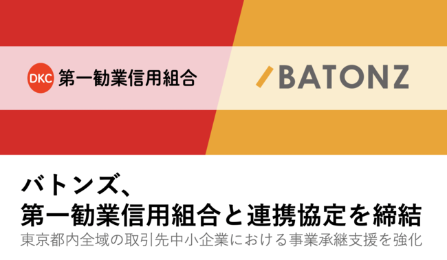 M&A総合支援プラットフォーム「BATONZ(バトンズ)」を運営する株式会社バトンズ(本社:東京都中央区、代表取締役:神瀬 悠一、以下バトンズ)は、第一勧業信用組合(本社:東京都新宿区、理事長:野村 勉)と中小企業における第三者承継・M&Aを支援するための協定を締結したことをお知らせします。