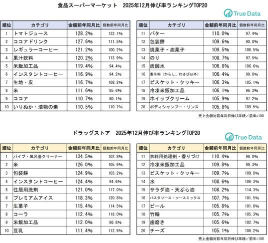 ビッグデータプラットフォームを運営する株式会社True Data(トゥルーデータ/本社:東京都港区、代表取締役社長:米倉 裕之、証券コード4416)は、当社の統計データをもとに、ドラッグストア、食品スーパーマーケットにおける2025年12月の売り上げ伸長カテゴリを発表します。