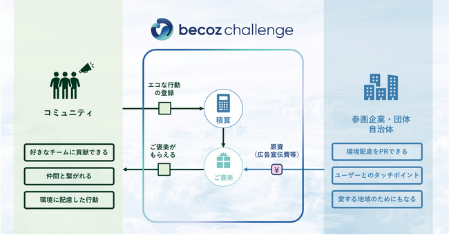 「becoz challenge」は、資源のリサイクルや自転車・徒歩の移動などの生活者の環境に配慮した活動をポイント化し、企業・団体などが用意するグッズやサービスなどとの交換や寄付ができるサービスです。自分のエコな行動が「好きなチームや企業にとってプラスの効果を与えている」ことを実感でき、企業・団体にとっては自社のユーザーやファンの行動変容を促し、脱炭素や循環型社会実現に貢献することができます。