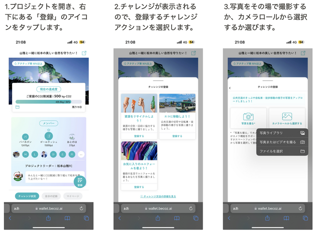 3月26日(日)~6月17日(土)までの期間、ユーザーに日々の暮らしの中でのエコな行動を「becoz challenge」アプリ上で記録いただきます。環境省が提唱する「ゼロカーボンアクション30」などのデータをもとに環境負荷を計測し、ユーザーのエコな行動をポイント化します。実証では「資源をリサイクルしよう」「エコに移動しよう」「お気に入りのユニフォームを着よう」の3つのチャレンジテーマを用意し、チームの応援をしながら楽しくサステナブルな選択をできるよう促します。