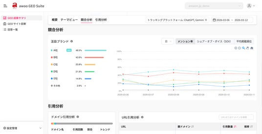 「awoo GEO Suite」は、こうした課題に対応するためのサービスです。企業が生成AI時代におけるブランドの見え方を把握し、今後の情報発信やWeb整備の方向性を検討するための基盤として活用いただけます。