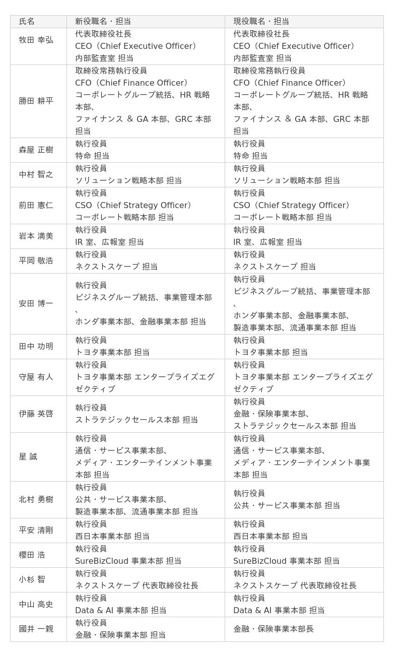 日本ビジネスシステムズ株式会社(本社:東京都港区 代表取締役社長:牧田幸弘、証券コード:5036)は、2025年4月1日付で下記の通り役員人事、人事異動並びに組織改編を実施することをお知らせします。