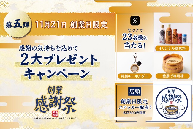 23周年にちなみ合計23名様に、創業感謝祭ロゴ入り『釜揚げうどん』専用桶、特製キーホルダー、オリジナル調味料のセットが当たるXキャンペーンを実施いたします。さらに、ご参加いただいた全員にハズレなしでお得なクーポンやスマートフォン用の特製壁紙のプレゼントもご用意しております。ご自宅や職場など、お好きな場所で丸亀製麺をお楽しみいただけるオリジナルグッズをぜひこの機会にゲットしてください!