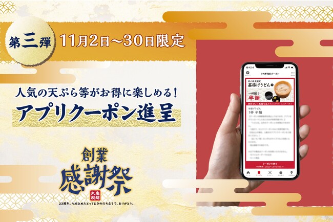 11月2日(木)~ 30日(木)の期間限定、週替わりで人気メニューがお得に楽しめるクーポンを丸亀製麺公式アプリにて配信。