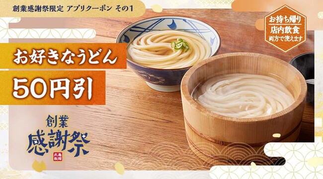 創業月の11月には、丸亀製麺の手づくり・できたてのおいしさを存分にお楽しみいただきたく、打ち立てのうどんや店内で丁寧に仕込む天ぷらがいつも以上にお得に楽しめるクーポンをご用意。お好きなうどん、人気の天ぷら『野菜かき揚げ』『いか天』『かしわ天』の合計3種類『いなり』が50円引きになるクーポンを配信いたします。