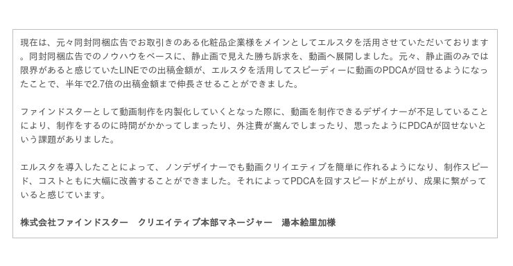 ファインドスターは、LetroStudioを利用してクライアントから出稿委託されたLINE広告向けの動画クリエイティブの制作を開始しました。LINEが推奨する最新のデザインや訴求、LetroStudio独自の研究から生まれたエルスタの動画テンプレートと、パワポ感覚で操作可能な柔軟な編集機能を搭載するLetroStudioを利用することで、ノンデザイナーであるアシスタントディレクターでも、良質な広告クリエイティブを素早く制作することが可能に。更に、配信結果に基づいたクリエイティブ改善が自身で行えるようになったことで、「運用型制作」と言えるような広告成果改善のためのクリエイティブ運用をスピーディーに実現できるようになりました。