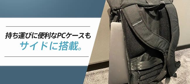 ノートPCの持ち運びに便利なPCケースもサイドに搭載。背中のクッションが緩衝材となり衝撃に弱いPCをしっかりガードします。