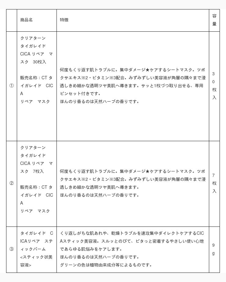 シートマスク開発におけるクリアターンの高い技術力と、タイガレイドの肌トラブルケア効果を凝縮した「クリアターン タイガレイド CICAリペア マスク」を発売することで、より積極的に肌トラブルをケアしたいと考えるお客さまのニーズに応えてまいります。