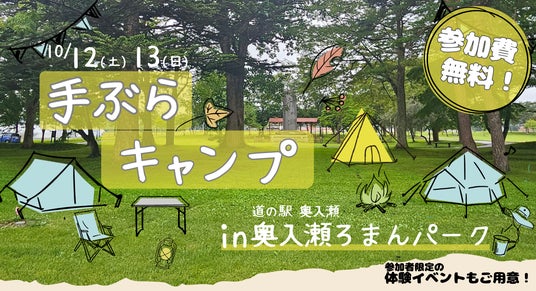 一般社団法人十和田奥入瀬観光機構(理事長:岩間 惠美郎)は一般財団法人 十和田湖ふるさと活性化公社(理事長:佐々木 千佳子)のご協力のもと、2024年10月12日(土)・13日(日)に「道の駅奥入瀬 奥入瀬ろまんパーク」にてモニターツアー「手ぶらキャンプ in奥入瀬ろまんパーク」を開催いたします。