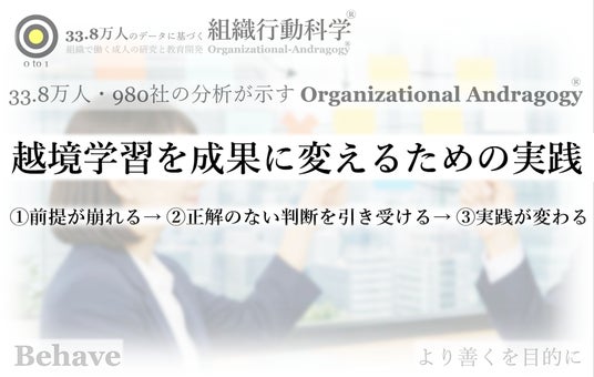 「1.前提が崩れる→ 2.正解のない判断を引き受ける→ 3.実践が変わる」。 学習が起きる仕事設計を、比較と実装で確定する(Organizational Andragogy(R))