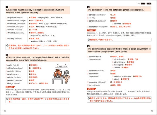 本書に収録の254例文で、TOEIC頻出の単語・熟語が覚えられます。例文の長さ、単語の意味はすべて試験にあわせて作成し、少ない時間でもっとも効率よく学べる仕組みです。