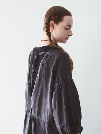 一方は、クルーネックでボタン空き、もう一方は大きく空いたVネックになっており、さまざまは表情を楽しめるのが嬉しいポイント。袖は、細やかなギャザーを贅沢にあしらったバルーンスリーブ。程良いゆとりと裾広がりのAラインシルエットが女性らしい1枚となっております。