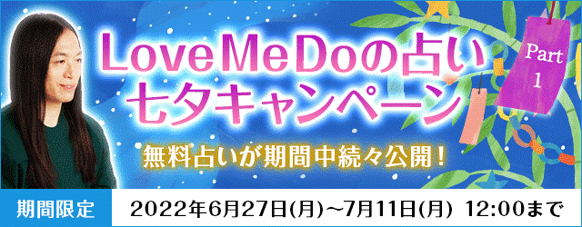 有名芸能人の結婚やスキャンダルから自然災害、政治・経済まで様々なニュースを的中させる『予言的中の占い師』Love Me Do。現在、月額公式サイト『ラブちゃん占い』にて、『Love Me Doの占い 七夕キャンペーン Part1』を開催中です。7月7日の七夕にちなみ、キャンペーン期間中は毎日、恋愛や結婚、出会い運の無料占いを1項目ずつ無料公開いたします。ぜひこのお得な機会にお試しくださいませ。